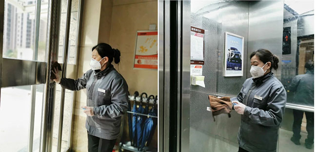 9号楼的保洁大姐张炎除了日常环境维护外,还要对单元门把手、电梯按键、电梯轿厢、业主门把手进行一天至少4次的消毒,说是4次,但是门把手和电梯按键她都记不清楚每天用酒精擦拭多少遍。