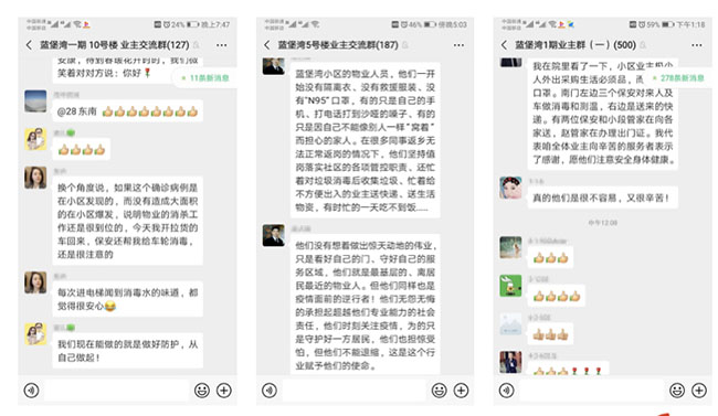 蓝堡湾1225户业主,即使春节假期常住户也有900多户,每天配送量达四五百份,大大增加了项目的工作量。1月31日-2月3日期间,业主集体团购的酒精及其他防疫物资到货,3000瓶的酒精,他们一户户上门配送,从早忙到晚,项目秩序负责人赵连征上楼配送时不小心扭到脚,却仍拖着肿着的脚为业主配送物资,不肯休息... ...
