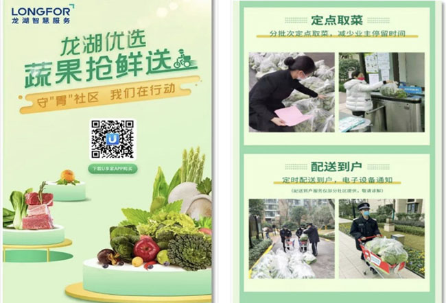 龙湖智慧服务:疫情期间,我们和永辉超市合作推出了线上蔬果和日用品采购,第一天就爆单了,仅重庆一地的业主就下了5000多单,我们重庆公司的管家部、社商经营部,包括公司的管理人员,一起送货到业主家里,一直送到夜里12点多。而送货完毕之后,又开会到凌晨3点进行总结和复盘,为第二天的工作做相关的铺排。