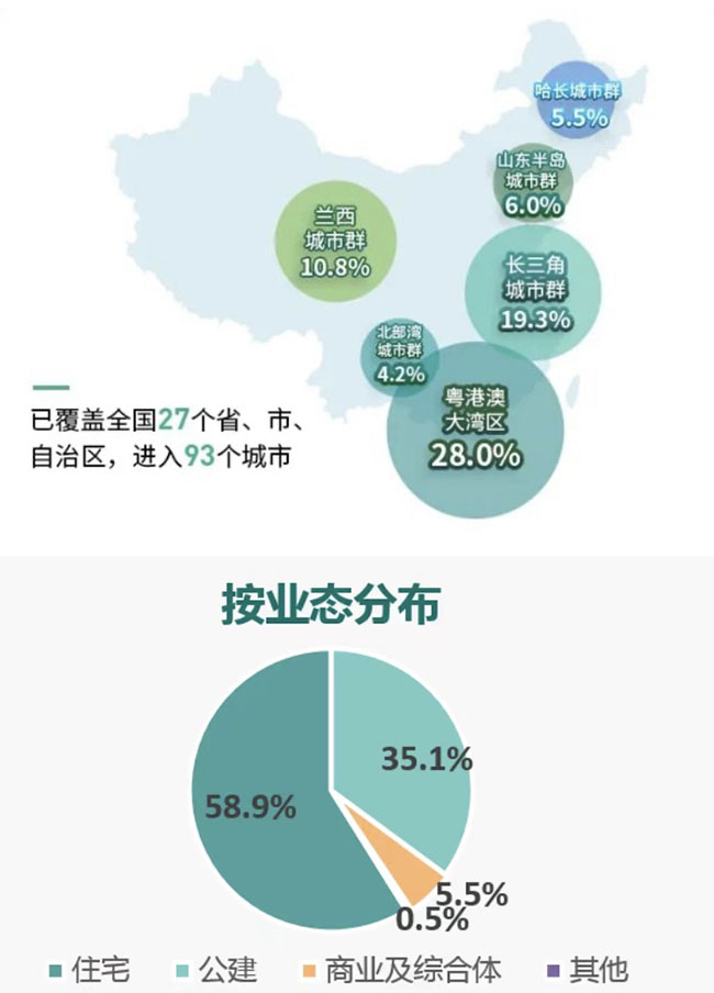 2019年,雅生活在管项目达1180个,覆盖全国27个省、直辖市、自治区,共计93个城市。按业态划分,住宅占比为58.9%,公共建筑占比为35.1%,商业及综合体占比为5.5%,余下为顾问咨询及其他业态的项目。按区域划分,28%位于粤港澳大湾区,19.3%位于长三角城市群,10.8%位于兰西城市群,6%位于山东半岛城市群,5.5%位于哈长城市群,其余分布于中国其他区域。完成中民物业及新中民物业收购后,雅生活在管面积将超过5亿平方米,在管项目将突破3000个。