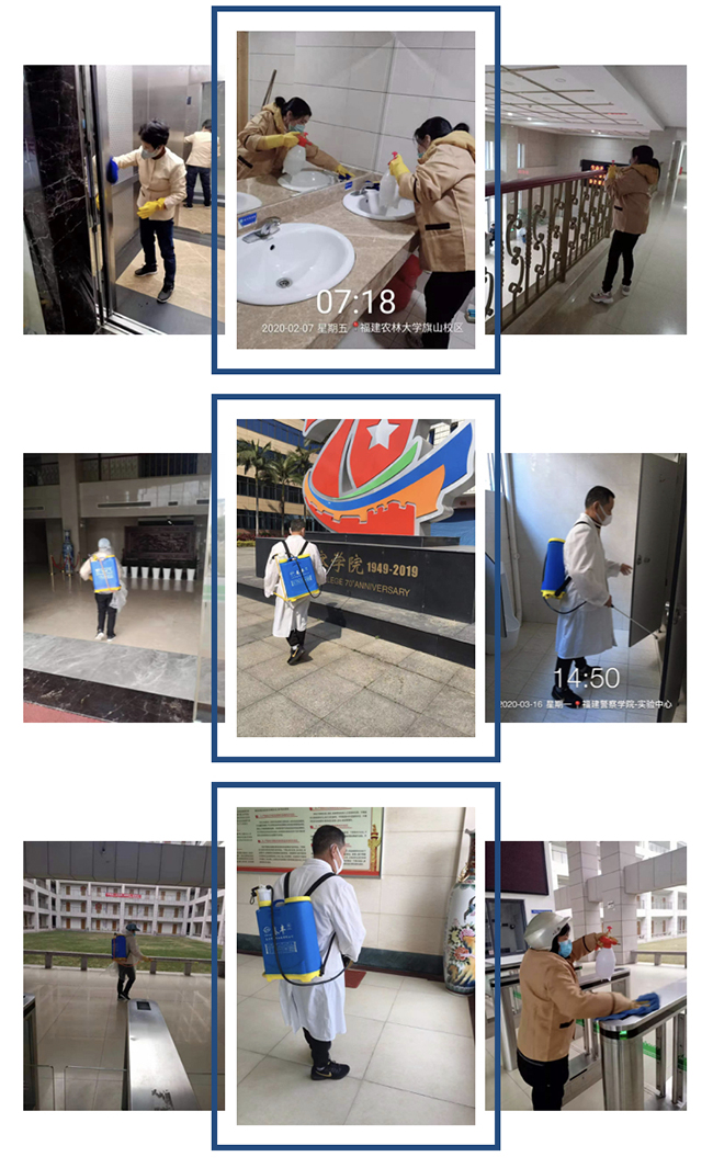 福建永安物业管理有限公司(下文简称“永安物业”)积极响应党和国家防控疫情的号召,积极落实各级政府的防控部署,努力落实好在管项目严防严控措施,防止境外疫情输入,全力支持复工复产。公司承接在管的福建农林大学(旗山校区)和福建警察学院项目,防控工作始终没有放松警惕,一直持续紧锣密鼓、扎扎实实的做好基础工作的同时,采用先进的机械助力,打出抗疫“组合拳“,切实把保护师生的生命安全和身体健康放在第一位,精细防疫迎接开学季。