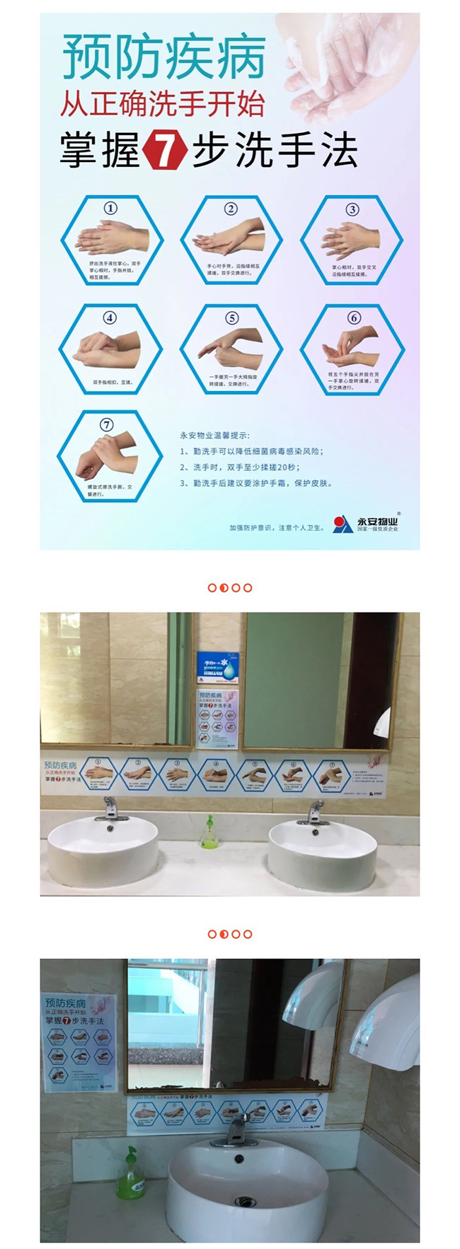 积极配合学校切实对新冠肺炎的预防措施及注意事项进行宣传,精心制作出“永安物业预防疾病7步洗手法”宣传海报,图文并茂,便于理解、操作,粘贴在校园的每一处洗手台以及卫生间显眼处,美观的同时增强工作人员防范意识。