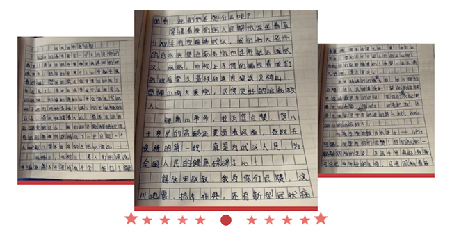 在他的笔端,新型冠状病毒肺炎疫情以来的点点滴滴一幕幕重现。2020年的春天因疫情变得不同寻常,不仅学校开学、日常出行、走亲访友、基本生活用品采购等受到限制,而且产生了许多病情伤痛、支离破碎。面对疫情挑战,中华大地涌现了“钟南山爷爷”、“解放军叔叔”、“医术精湛的治病专家”、“可爱可亲的白衣圣士”、“奋战在实验室里研究新型冠状病毒治疗的科学家们”、“小区物业的叔叔”等逆行者,他们“顶着风险”、“不畏生死”、"没有睡一宿安稳觉“、”甚至还来不及吃饭”。他用尚显稚嫩而又十分生动的语言,记录了疫情以来,各条战线的华夏儿女众志成城、砥砺前行的感人画面。