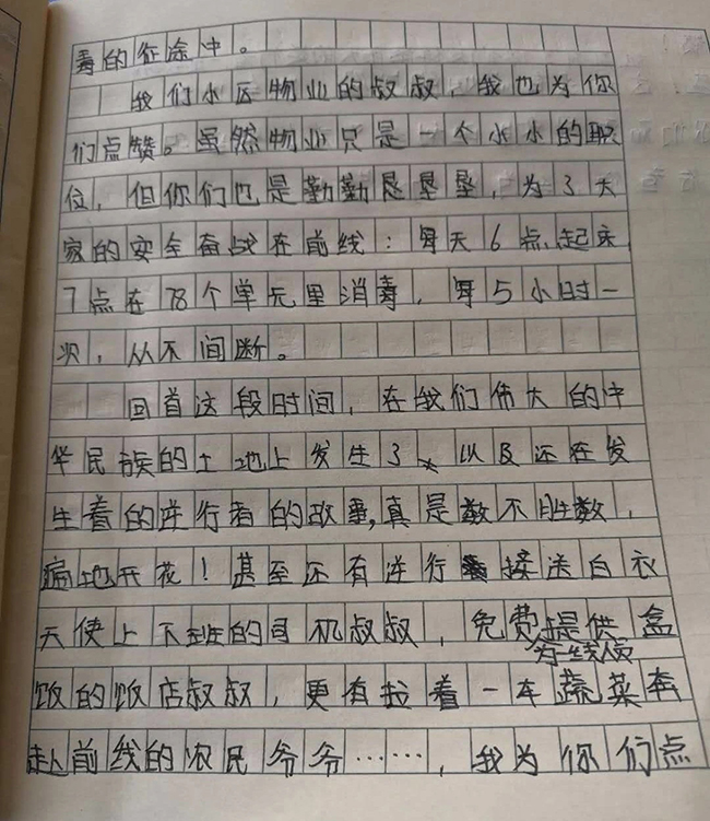 “我们小区物业的叔叔,我也为你们点赞,虽然物业只是一个小小的职位,但你们也是勤勤恳恳,为了大家的安全奋战在前线:每天6点起床,7点在78个单元里消毒,每5小时一次,从不间断”,他在日记中这样写道。
