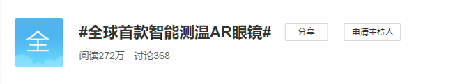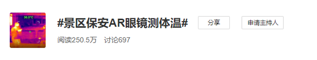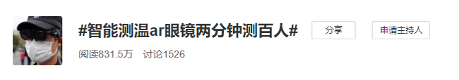 25日,#智能测温AR眼镜两分钟测百人”的话题登上了微博热搜,目前阅读量超过830万。与之相关的还有#景区保安AR眼镜测体温#(250万)和#全球首款智能测温AR眼镜#(272万)两个话题,综合阅读量破1350万。