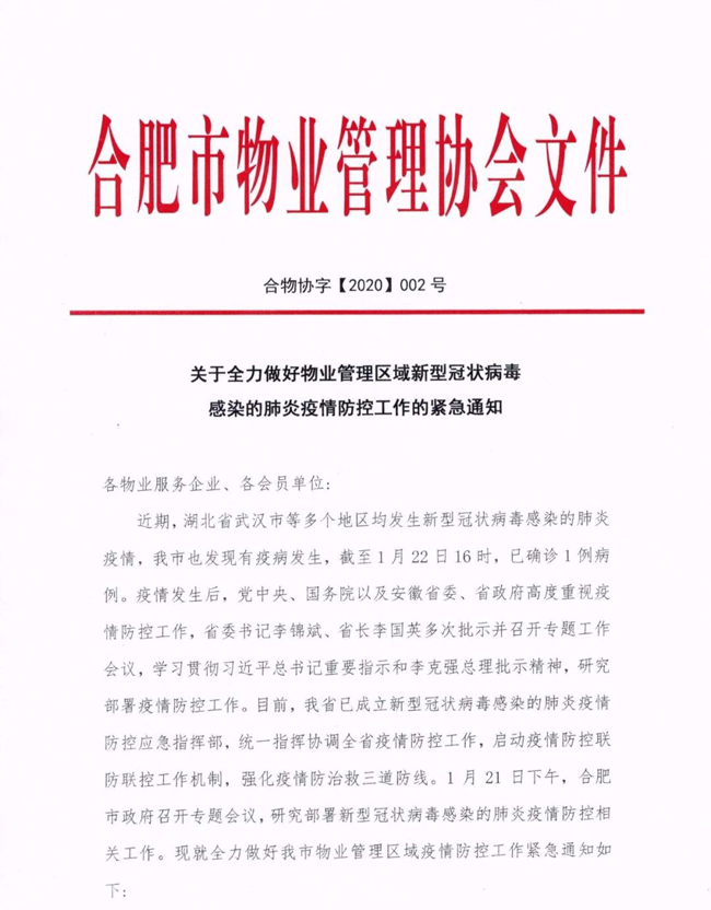 1月23日,合肥市物业管理协会向合肥物业行业发出了《关于全力做好物业管理区域新型冠状病毒感染的肺炎疫情防控工作的紧急通知》,组织我市物业企业迅速启动疫情防控应急预案,将此次疫情防控作为当前的重要任务和首要工作。全面拉开了合肥物业行业疫情防控工作的序幕。