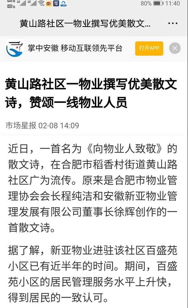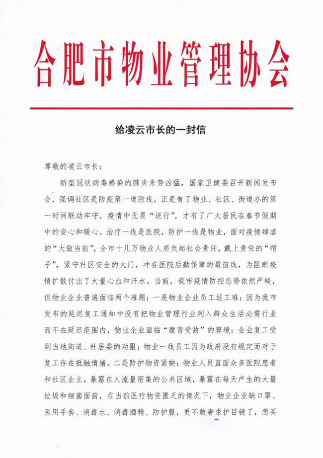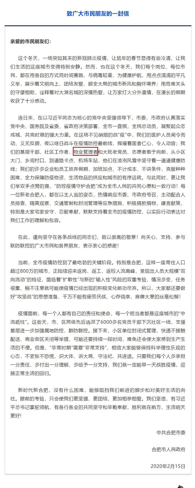 2月15日,在合肥市委市政府《致广大市民的一封信》中,将物业管理者和社区工作者作为疫情防控的主要力量,更坚定了抗击疫情的决心。