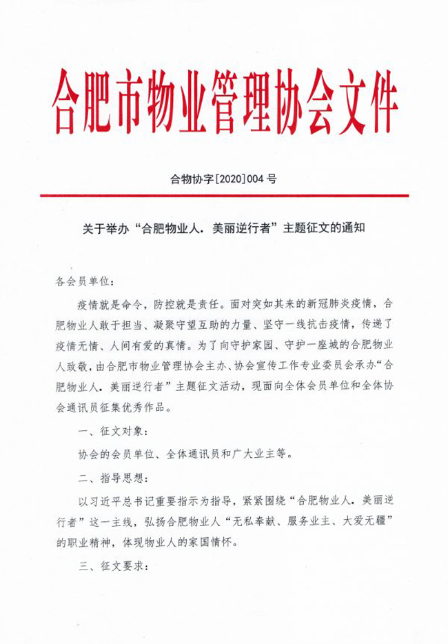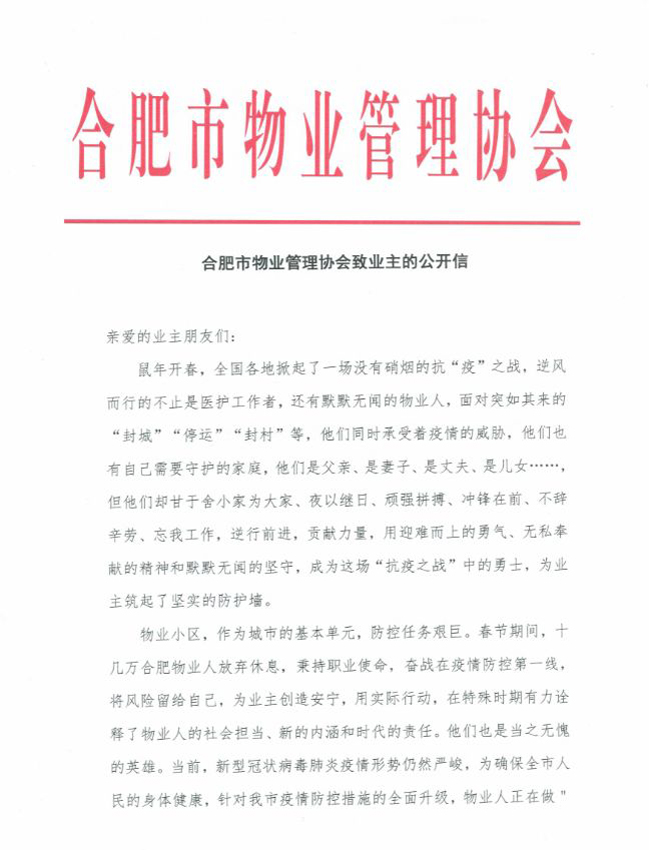 2月7日,在《合肥市物业管理协会致业主的公开信》中,呼吁社会理解物业行业、支持物业工作,发动业主联防联控,切实做好物业管理区域疫情防控工作。