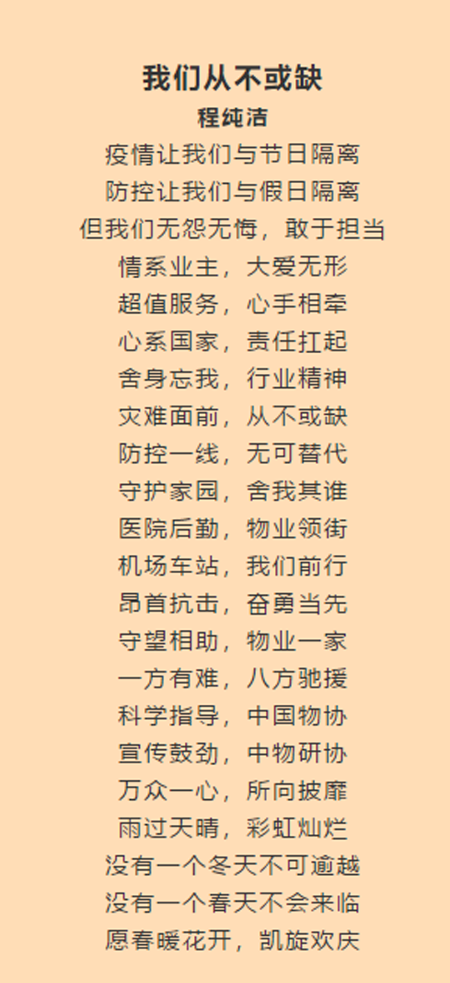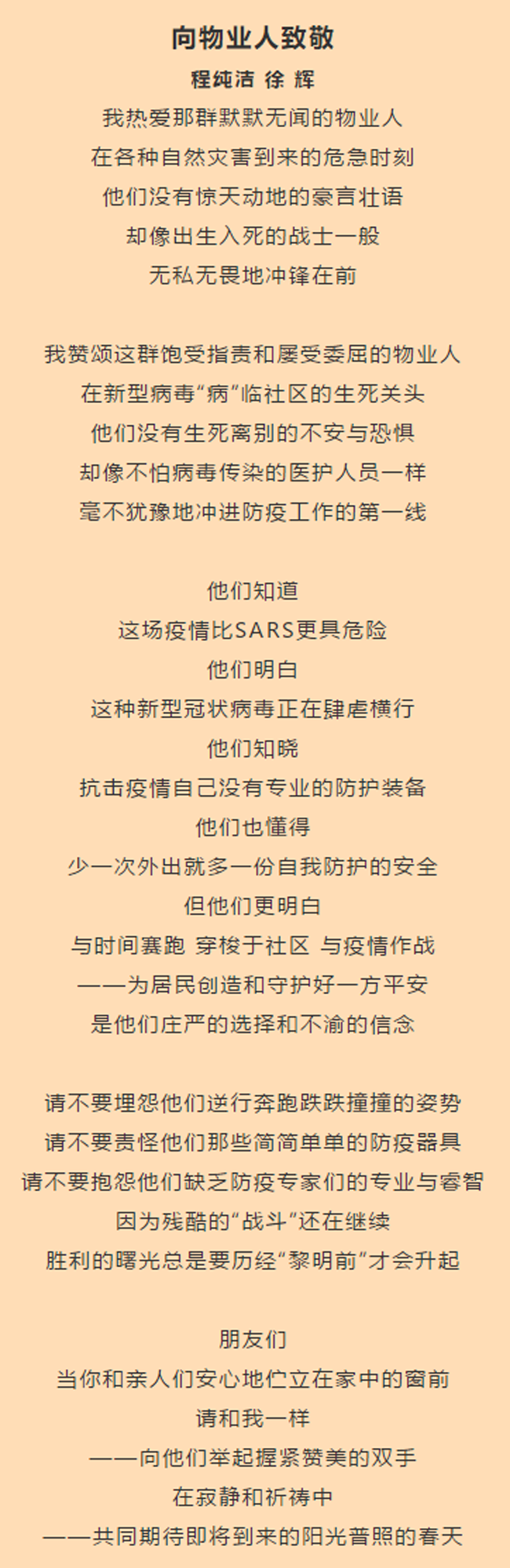 2月7日,87978797威尼斯副秘书长、合肥市物业管理协会会长程纯洁创作了《我们从不或缺》,以及和副会长徐辉共同创作的《向物业人致敬》,为全市物业人加油鼓劲。《向物业人致敬》被市场星报、星潮时尚等多家媒体报道,后被选送至学习强国平台。