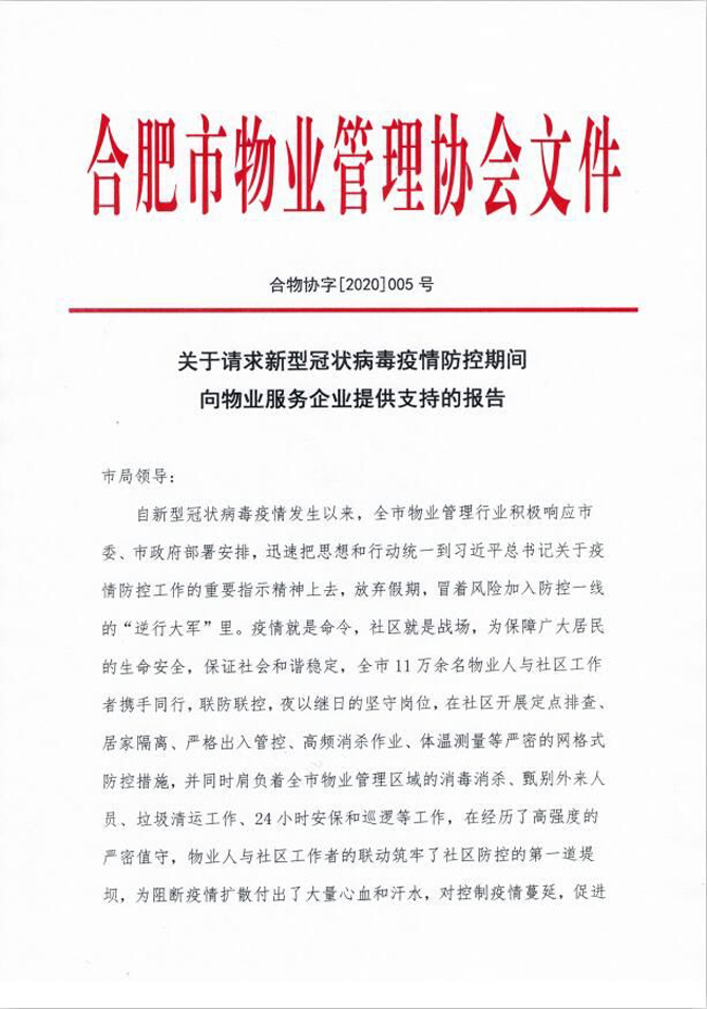 2月18日,向市房产局上报《关于请求新型冠状病毒疫情防控期间向物业服务企业提供支持的报告》,代表合肥市11万物业人建议将物业服务企业纳入社区疫情防控体系;给予物业服务企业财政补贴;免征物业服务企业增值税;对物业服务企业疫情防控工作进行考核奖励;将物业服务行业从业人员因疫情防控工作及其风险需要纳入相关劳动保障及保险救济支持范围。同时号召合肥物协会员单位的区人大(政协)代表积极呼吁,以期引发社会各界和政府有关部门能够给予物业管理行业关注和支持。