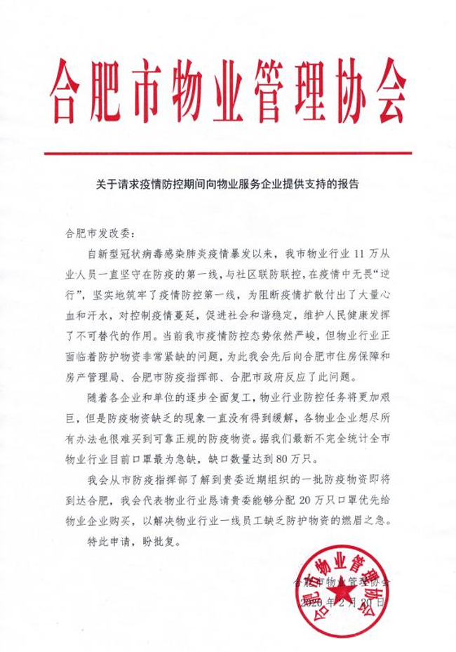 2月20日,协会向合肥市发改委申请《关于请求疫情防控期间向物业服务企业提供支持的报告》,将全市物业行业口罩紧缺的数据统计并上报,再次为全市物业企业多争取了一个物资购买渠道。