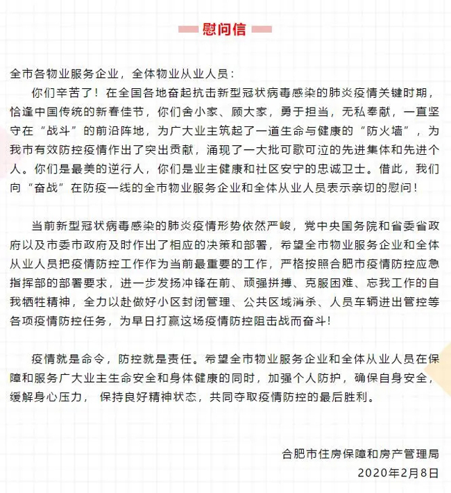 2月8日,在全市奋起抗击新型冠状病毒感染的肺炎疫情关键时期,合肥市住房保障和房产管理局的一封《致奋战在疫情防控第一线全体物业人的慰问信》鼓舞了全市物业管理行业全体物业人的士气!