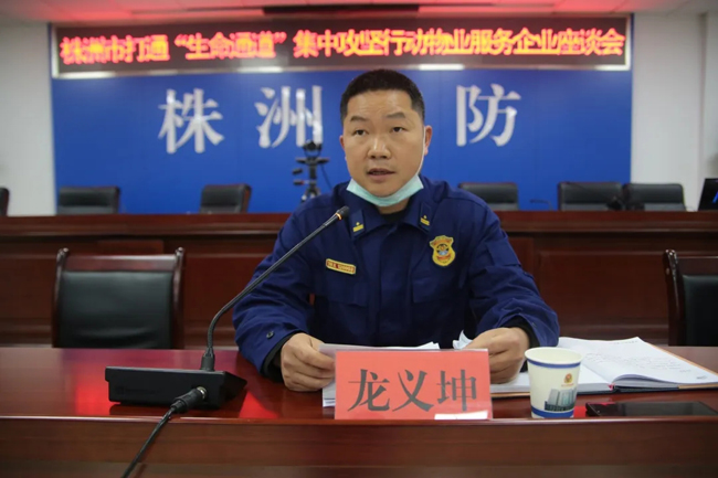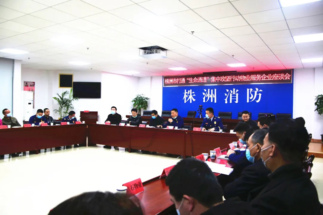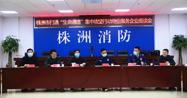 2020年3月30日,株洲市消防支队和市住建局联合召开打通“生命通道”集中攻坚行动物业企业座谈会。市消防支队党组成员、副支队长龙义坤、市住建局党组成员、副局长刘波,市物业事务中心主任陈琪、副主任张志刚,市消防支队防火监督科科长刘昆,市物业管理协会会长马文新,各区物业指导中心主任、各区消防大队长及20家有代表性的物业服务企业负责人参加会议。市消防支队党组成员、副支队长龙义坤主持会议。
