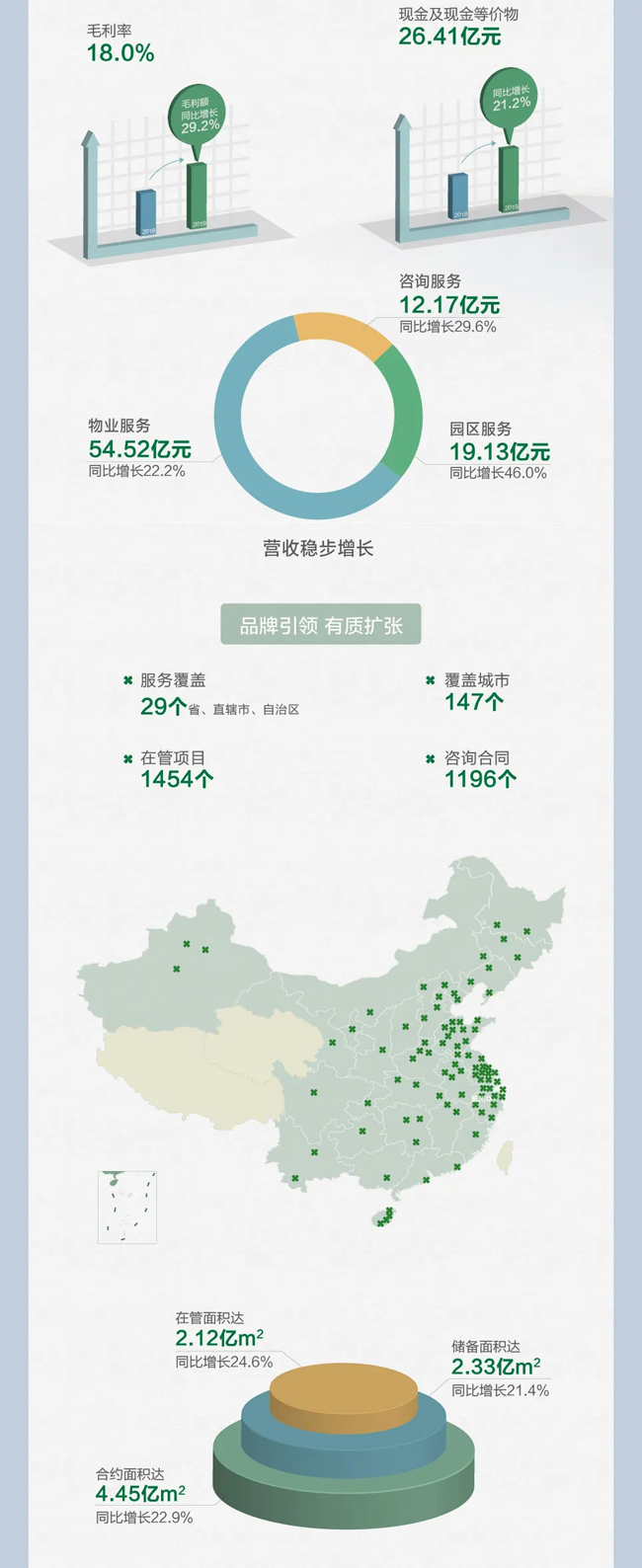幸福生活服务商愿景下,绿城服务坚持战略定力、坚守独立价值,物业服务、园区服务、咨询服务三块业务协同发力,稳健向好: