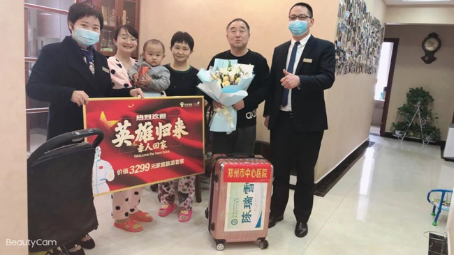 29日出征,42日凯旋。54天的日夜奋斗,驰援武汉的郑州人民医院急诊科护士长邵青青、郑州市中心医院陈瑞雪医生结束了为期14天的集中休养,回到天伦锦城与家人团聚。锦城物业服务中心铺设了红毯,准备了鲜花,并赠送价值3299的家庭旅游套餐卡,代表天伦物业对英雄致以崇高敬意。