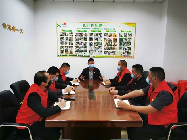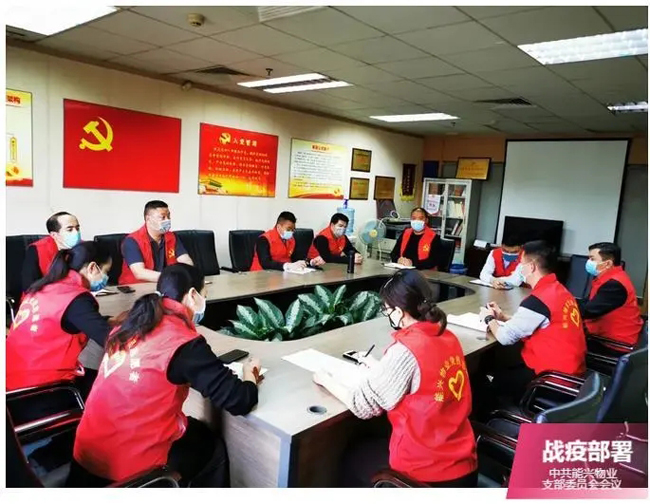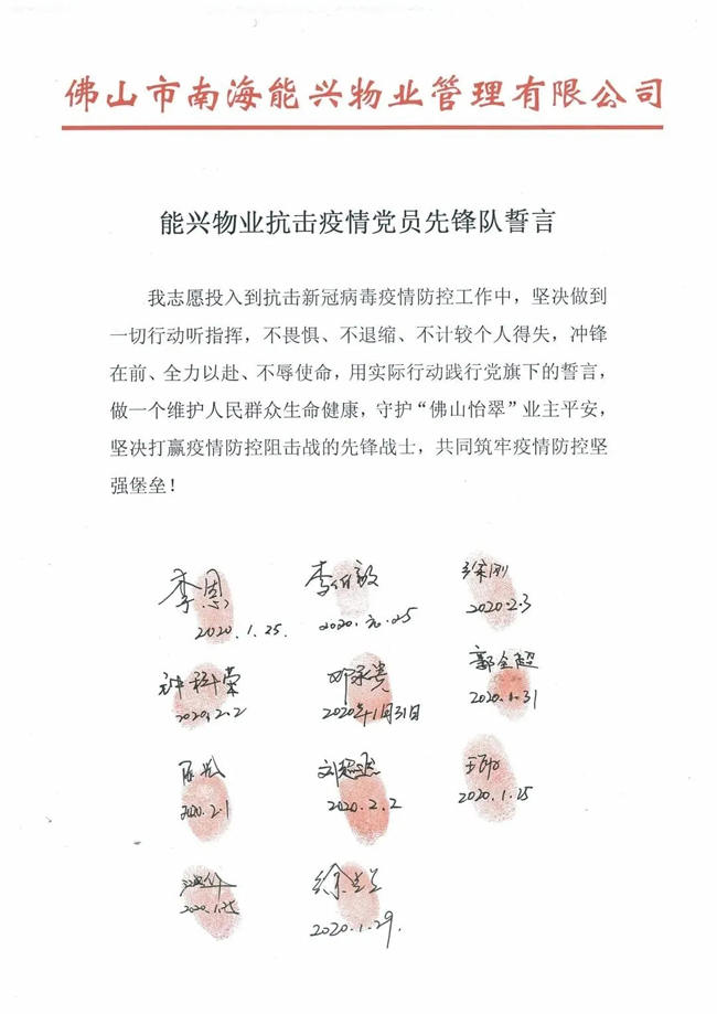 新冠肺炎病毒疫情防控阻击战打响以来,中共佛山市南海能兴物业管理有限公司支部委员会第一时间成立疫情防控党员先锋队,公司以舒刚毅总经理为班长的经营班子全体成员、6名共产党员,5名入党积极分子,33名主管级以上管理人员纷纷响应,第一时间进驻公司管辖住区疫情防控一线,多措并举开展各项疫情防控工作,为佛山怡翠超两万个家筑造起一道道牢牢的生命防线,让党旗在防控疫情斗争第一线高高飘扬。