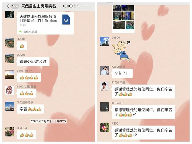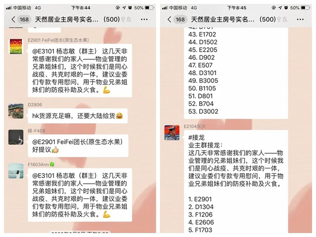 “这几天非常感谢同心战役、共克时艰的家人——物业管理处的兄弟姐妹们,建议业委们调拨专款慰问,用于物业兄弟姐妹们的防疫补助及伙食。”2月9日,一名业主在群里发起倡议,其余业主在群里纷纷接龙,短时间里就有五十余户业主响应。