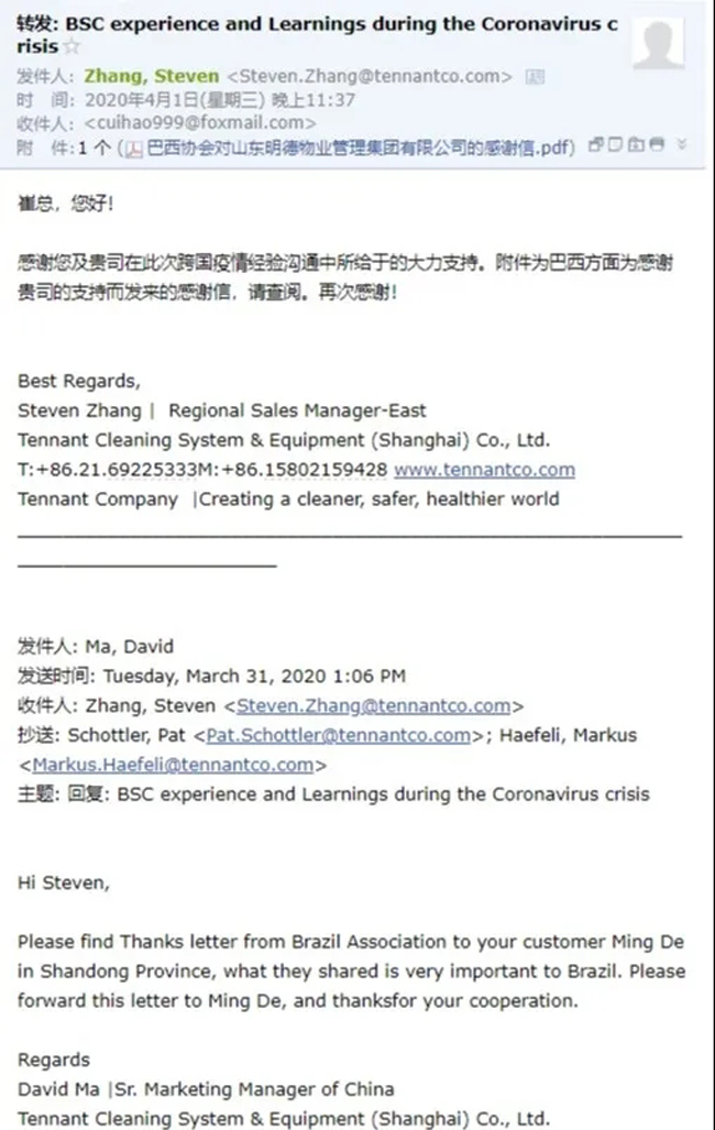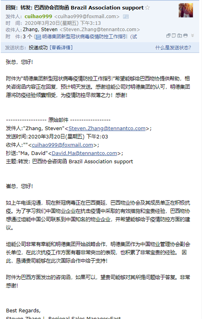 明德集团在收到巴西专业清洁市场协会的咨询函后,由明德集团商业经营、运营管理中心牵头对其提出的十个疫情防控相关问题进行详细解答,并将《明德集团新型冠状病毒疫情防控指引》赠与巴西物协,希望能够为其疫情防控工作的开展尽微薄之力。