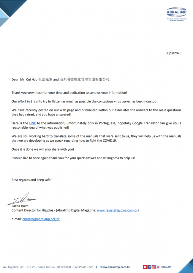 巴西专业清洁市场协会收到明德的回复及赠送的《指引》后,向明德集团发来感谢信,信中表示巴西专业清洁市场协会正参考明德的《指引》制定他们自己的指引手册,并将明德集团回复的问题内容在巴西《Higiplus》杂志网站进行刊登。