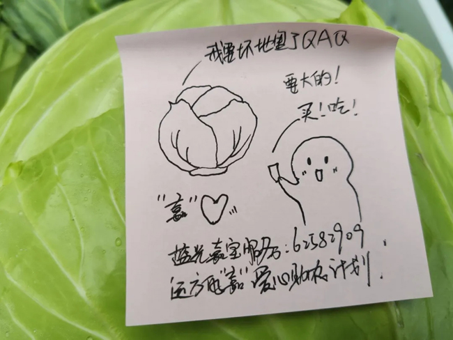 客服小姐姐们为莲花白附上手绘便利贴,以漫画的形式向业主“求助”。在防疫期间,蓝光嘉宝服务做到了既安全又有温度的线下物业服务。