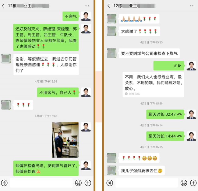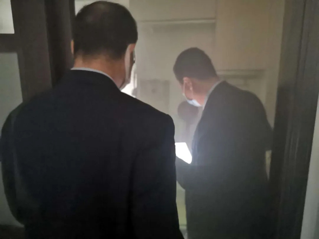 14:32分当下紧急使用对讲机呼叫同事,手提灭火器,追寻着气味火速冲往事发单元,发现屋内明火,情况危急。