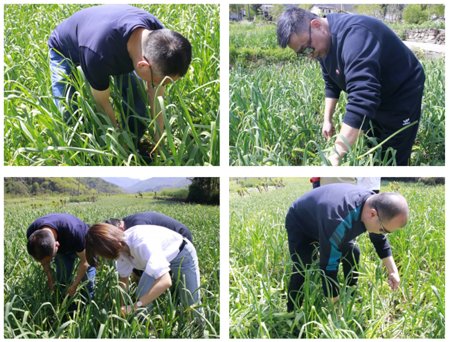 之后,大家随王书记沐浴在日光下,穿梭在碧波荡漾的农田间,一起体验农耕文化,亲自下地拔蒜苔。我们每人拿着工具,在书记的演示下,用一只手握住带把手的一头,将带铁钩的另一头插入蒜株中,由上到下,从蒜株中顺着划到离地面3-5公分的地方,斜着把蒜苔的根部折断,用另一只手提着蒜苔顶部,轻轻一抽,一根根又白又嫩的长蒜苔就出来了。