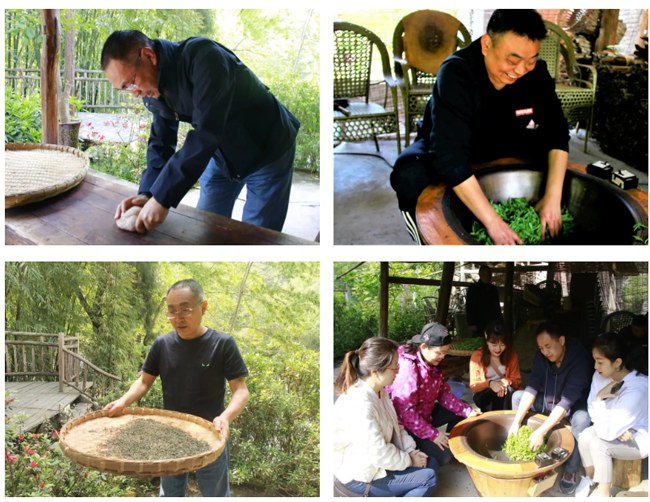 如果说采茶是体力活,那么炒茶便是技术活。在绿意葱茏的茶地里,一起体验采茶,别有一番风味。鲜叶采摘后,在手工制茶坊一睹制茶过程,只见手不离茶,揉中带炒,连续翻炒,直到叶子充分干燥才算制成。半天的时间,见证了每天喝的茶从嫩芽变成茶叶全部过程。大家不禁感叹道:传统制茶工艺作为非物质文化遗产需要我们传承,更深地发掘与学习。