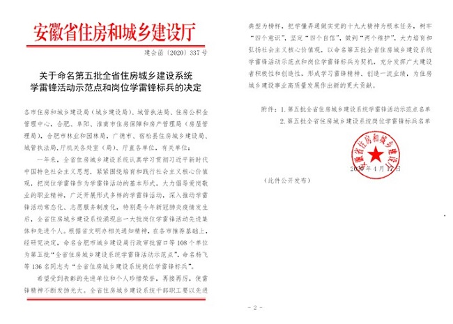 安徽省住房和城乡建设厅日前印发《关于命名第五批全省住房城乡建设系统学雷锋活动示范点和岗位学雷锋标兵的决定》,命名108个单位为第五批“全省住房城乡建设系统学雷锋活动示范点”,命名136名同志为“全省住房城乡建设系统岗位学雷锋标兵”。包含安徽省物业管理协会在内,全省物业管理行业共16个单位被命名为“学雷锋活动示范点”,15名同志被命名为“岗位学雷锋标兵”。