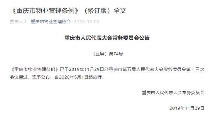 据悉,《重庆市物业管理条例》已于20191129日经重庆市第五届人民代表大会常务委员会第十三次会议通过,现已公布,并将于202051日起正式施行。