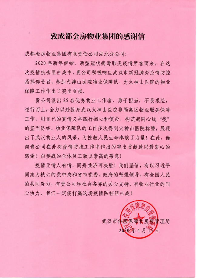 新冠肺炎疫情自爆发以来,金房物业的员工们一直坚持在一线,不计报酬,不惧生死,为全国各项目所在地的整体抗疫工作做出了金房贡献。4月15日我们收到了一封来自武汉市住房保障和房屋管理局的感谢信。