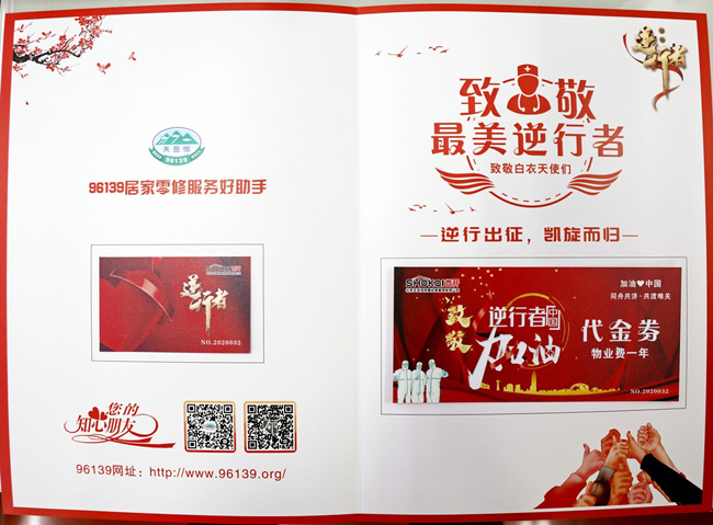 他们是逆行的的勇士,是我们身边的英雄。天岳恒为每位援鄂凯旋英雄准备了暖心礼包和慰问信,包括一张物业费抵扣券,一张96139服务平台VIP卡。
