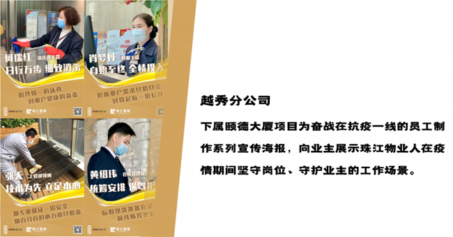 抗疫期间,物业人始终坚守岗位:对管理项目进出人员量体温,对各个公共区域进行消毒,更有同仁冒着被病毒感染的风险赴火神山前线抗击疫情。他们是守护者,逆行者,平凡的人做不平凡的事,是我们的英雄。我们珠江管理物业人将继续与广大业主同心协力、抗击疫情,愿疫情早日过去,回归到原有的生活。