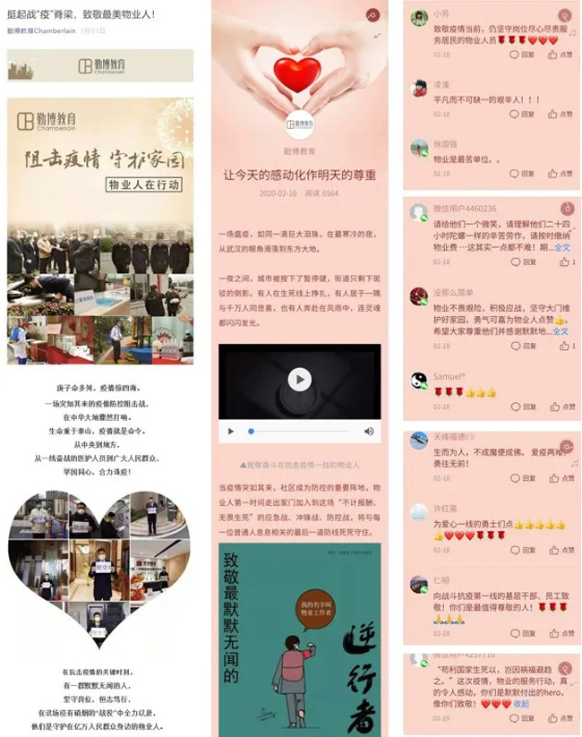 全国千万物业人舍小家顾大家,加入到这场“不计报酬、无畏生死”的防疫应急战、冲锋战、防控战中,涌现出许多可歌可泣的感人事迹,行业学院官方订阅号上发表的《挺起战“疫”脊梁,致敬最美物业人》 《让今天的感动化作明天的尊重》等原创文章,在行业内引发广泛关注和强烈共鸣,行业内外十多个公众号平台转载,让业主看到物业人的专业价值,向社会传递新时代物业人的精神风貌,为物业人赢得社会的认同和尊重,为物业管理行业未来发展鼓与呼。