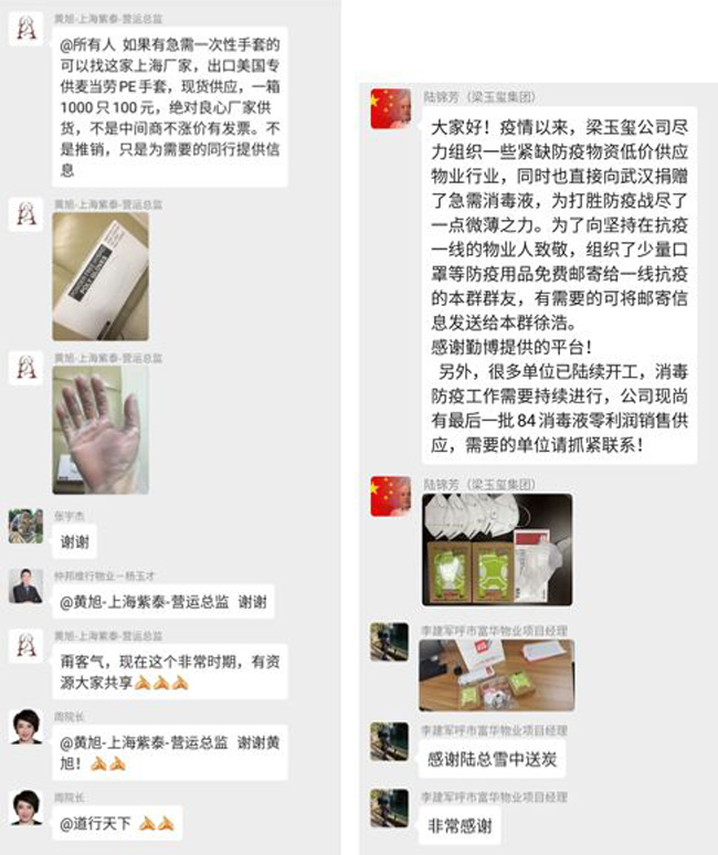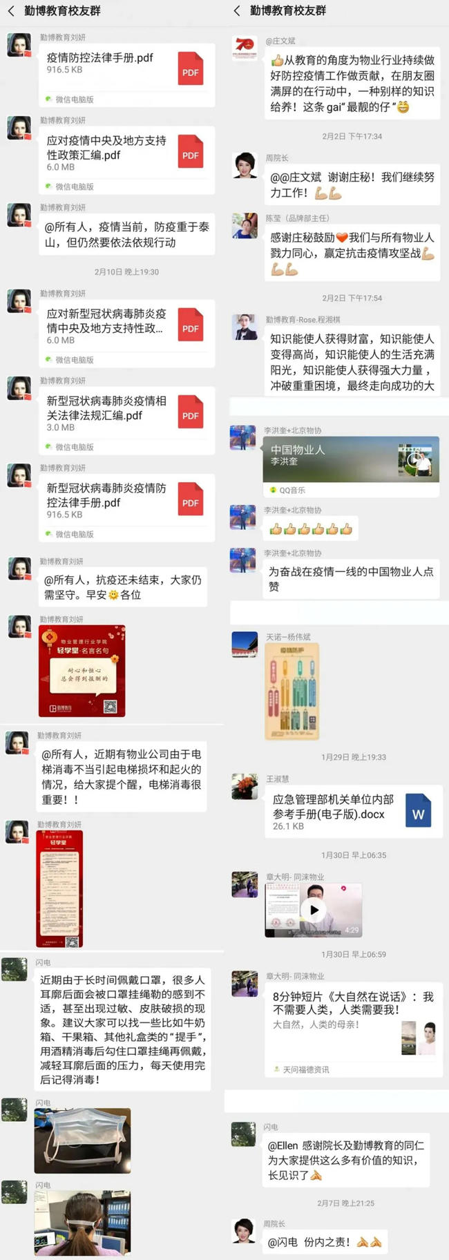 防疫物资全面告急成为许多物业服务企业抗击疫情中面临的最大困难,行业学院周心怡院长亲自协调联络,为校友企业搭建了防疫物资采购渠道的信息交流平台,同时还转发了《疾呼!防控第一线的物业防疫物资全面告急!》《速转!2020年最新全国口罩/消毒用品/防护服等防疫物资生产企业名录》等推文,帮助全国各地校友企业求助和寻找防疫物资订购的信息。