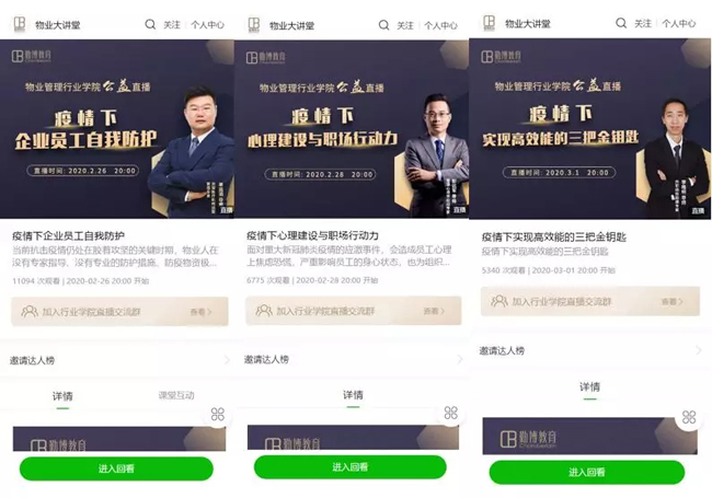 228日至31日,《疫情下心理建设与职场行动力》《疫情下实现高效能的三把金钥匙》也相继开播,来自福晟生活服务、深圳建发物业,深圳吉祥服务集团、深圳建业物业、前海人寿物业、嘉兴港区物业、天津创想物业、安徽华服物业、新疆新天物业、黑龙江万瑞物业等近百家企业组织员工全程观看或回放直播进行集体学习,三期直播观看和回放流量累计近4万人次。
