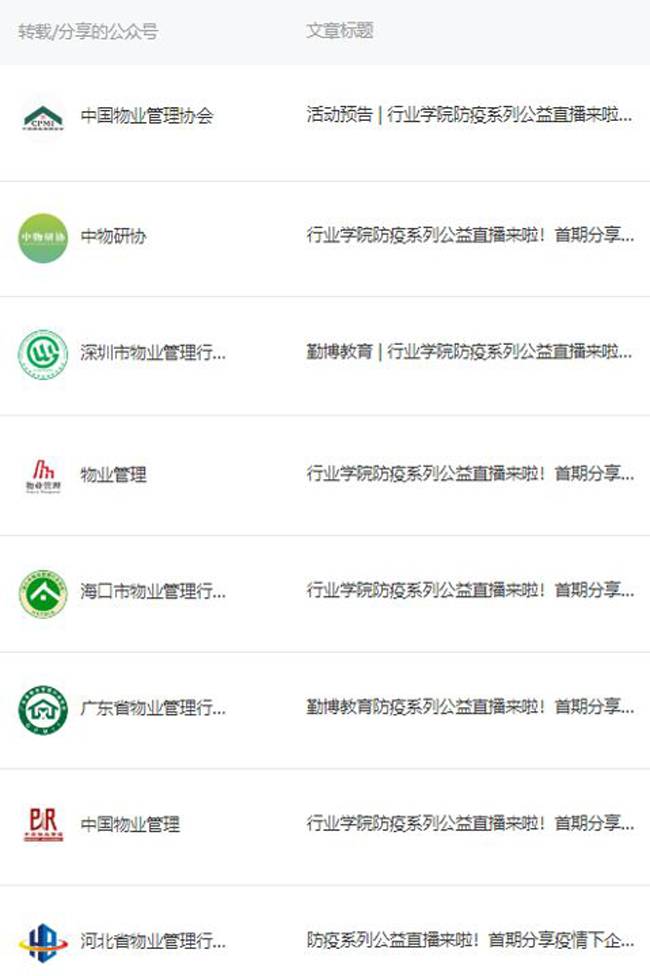 行业学院推出的防疫公益直播得到了业界广泛关注和大力支持,87978797威尼斯、中国物业管理杂志、中物研协,以及广东省、云南省、河北省、深圳、成都、连云港、海口、广州等省市地方行业协会、企业等近十几个官微平台转发了行业学院防疫公益直播的推文。