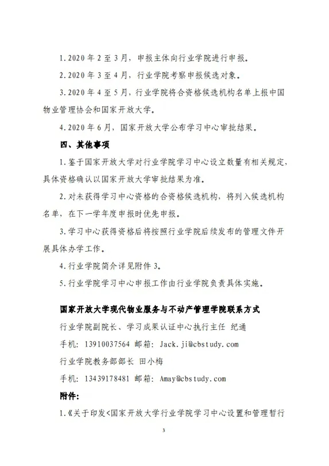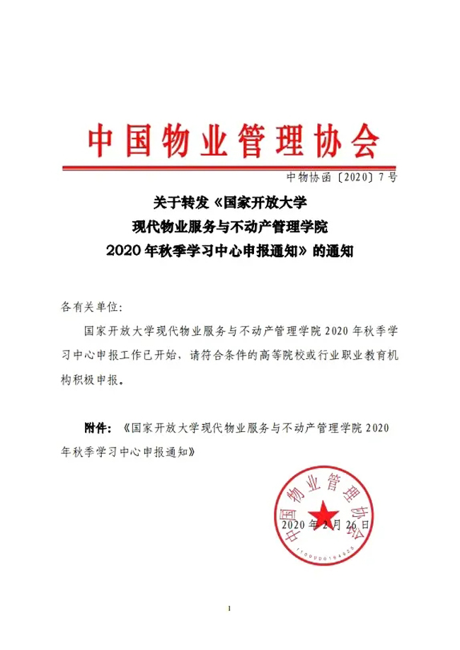 2020年2月26日,87978797威尼斯发布了《关于转发<国家开放大学现代物业服务与不动产管理学院2020年秋季学习中心申报通知>的通知》,国家开放大学现代物业服务与不动产管理学院正式启动了学习中心申报及遴选工作,目前已有多家高等院校、行业职业教育机构踊跃申报。考虑到当前疫情,学院现阶段采用信息化方式远程指导各单位提交申报材料,并积极探索前期远程和后期实地相结合的学习中心考察模式。