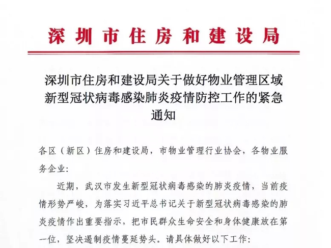 123日,广东省启动重大突发公共卫生事件一级响应。同一天,深圳市住房和建设局、深圳市物业管理行业协会(以下简称协会)先后向深圳物业行业发出了《关于做好物业管理区域新型冠状病毒感染肺炎疫情防控工作的紧急通知》,全面拉开了深圳物业行业疫情防控工作的序幕。