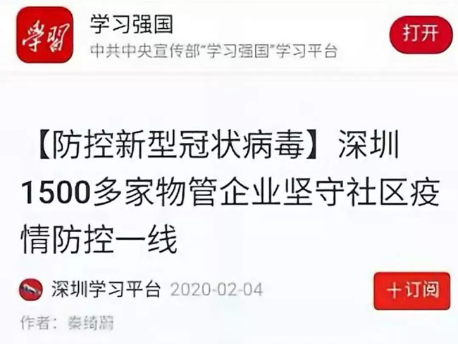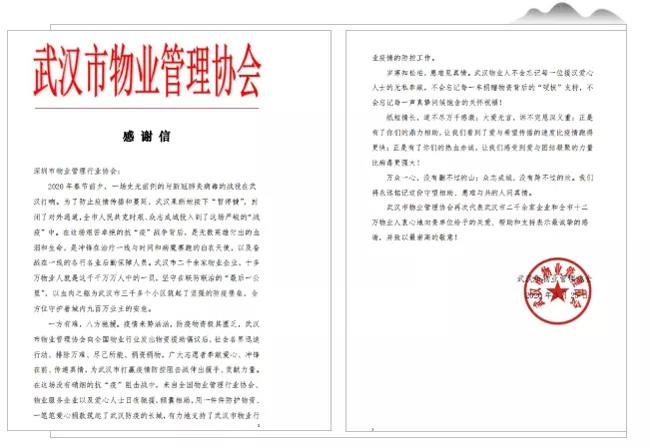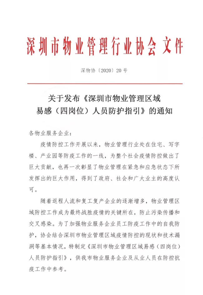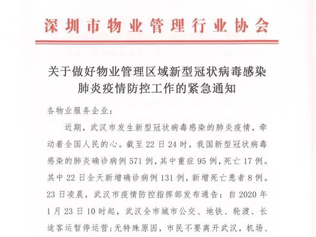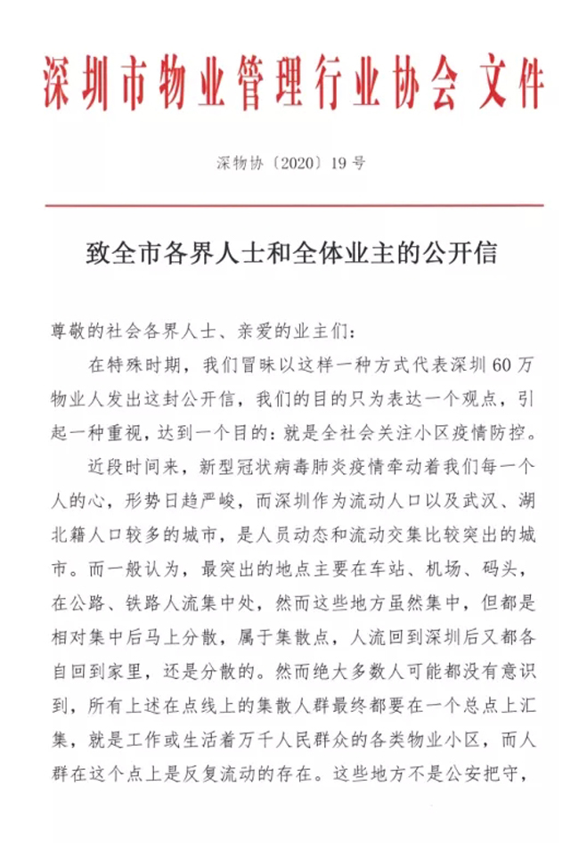 128日,深圳市物业管理行业党委和协会联合发出《致奋战在防控新型肺炎疫情一线物业人的一封信》,向奋战在防控新型冠状病毒肺炎疫情一线的物业人致以新春的问候和崇高的敬意!对广大物业人在疫情关键时刻勇于担当的精神给予肯定。