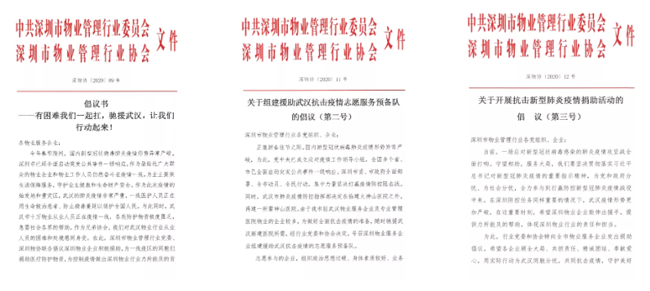 128日,随着疫情形势的严峻,武汉火神山等医院也开始启动建设,深圳的确诊人数也在持续增长,考虑到无论是武汉还是深圳,如果未来建设应急医院后,都急需大量后勤保障人员,而物业企业在这方面又有一定的优势,于是本着宁可备而不用、不可用而不备的原则,协会紧急发布援助武汉二号倡议《关于组建援助武汉抗击疫情志愿服务预备队的倡议(第二号)》,号召广大物业企业积极发动人员加入志愿服务预备队,展现行业在关键时刻的担当。同时,在了解到很多深圳物业企业由于无法筹集到援助物资,但又想通过捐款向武汉物业同行表达爱心的情况后,协会同一天又发出了《关于开展抗击新型肺炎疫情捐助活动的倡议(第三号)》,呼吁深圳企业向武汉同行伸出援助之手,提供力所能及的帮助。