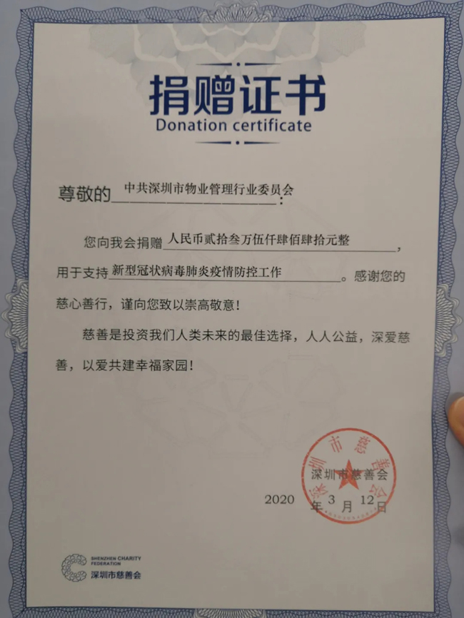 三份倡议发出后,不到一个月时间,共筹集到款项23.5万元和八批防疫物资,包括一吨消毒泡腾片、10000双手套、1220个护目镜、4100只口罩、300条消毒灯、20包消毒粉、10个喷壶、2台测温门、300条石英紫外线低压汞消毒灯等。这些物资中,除了有协会通过各种途径购买的外,还有嘉力达科技、国民物业、安杰信息科技、皓璟照明等爱心企业捐助的。勤诚达物业除了企业捐助1万外,还发动员工捐款2.7万余元,累计募集款项3.7万多元,另有多家物业企业捐款超过一万元。