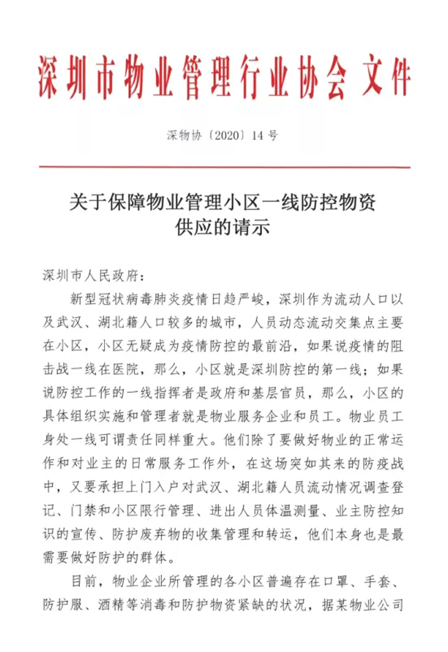 深圳市物协发出的公开信及保障一线防疫物资供应的请示▲