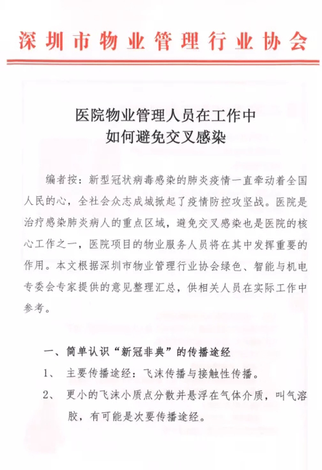 医院是治疗感染肺炎病人的重点区域,避免交叉感染也是医院的核心工作之一,医院项目的物业服务人员将在其中发挥重要的作用,130日,协会根据绿色、智能与机电专委会专家提供的意见整理汇总,制定了《医院物业管理人员在工作中如何避免交叉感染》的文件。该文件从个人做好预防交叉感染的防护”“特别注意拖把抹布与医用垃圾的处理”“对空调的运行管理与消毒等方面对医院物业人员在工作中如何避免交叉感染提供指引。