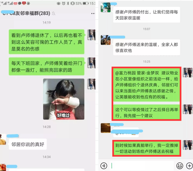 “我看到业主群里大家说的话,原来我做的每件小事都被记住了:在门岗值班那是我的本职工作,给大家开门提东西什么的都是应该的,疫情期间我也只是回来帮忙在门岗测温登记……大家都说很感动,我才是真的感动,谢谢你们能记得我和我做过的工作,谢谢你们为我这么操办个典礼。”