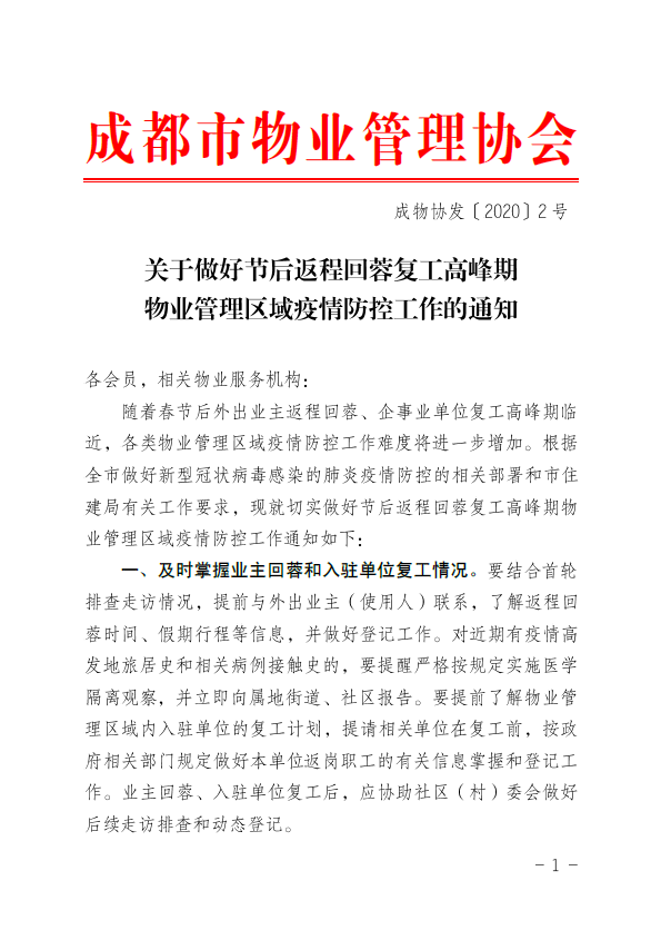 为积极保障有序复产复工,协会于1月30日印发《关于做好春节后回蓉复工高峰期物管区域疫情防控工作的通知》,对返程复工高峰期疫情防控工作提出六项要求。