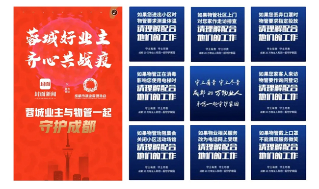 二是引导业主主动参与群防群控,联合封面新闻在全市发起“业主防疫九个主动”呼吁,超过110万业主通过网络接力承诺“做蓉城好业主,与物业共战疫”。通过微信九宫格这种醒目、易传播的形式,向全市业主发布了《请理解配合物管工作》《物管防疫要诀》《好好宅在家平安才有团圆》等系列宣传海报,呼吁广大业主配合支持物管防疫工作;三是针对社会认识误区,及时发表评论文章《减免疫情防控期间的物业费不可取,让物业人的劳动获得应有的回报和尊重!》,向广大业主发出依约缴纳物业费、鼓励提前预付物业费等呼吁,引导社会公众正向认识物业服务行业价值。