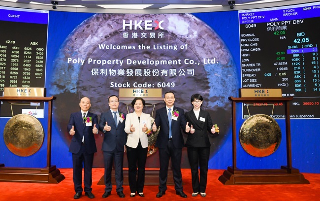2019年12月19日,保利发展控股集团董事长宋广菊(中)、总经理刘平(右二)、与保利物业董事长黄海(左二)、党委书记黎家河(左一)、总经理吴兰玉(右一)在港股主板上市现场合影。