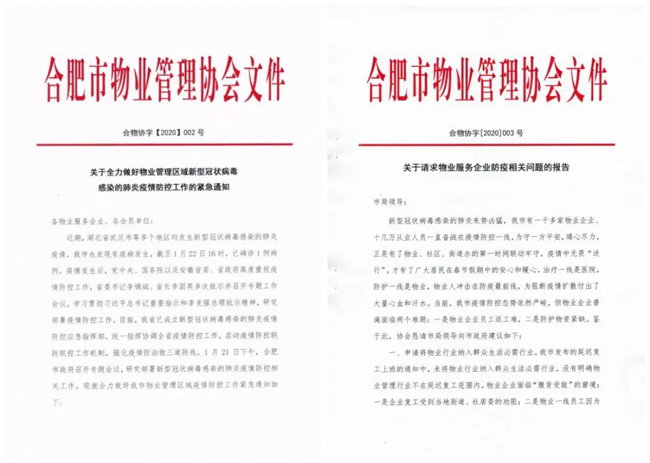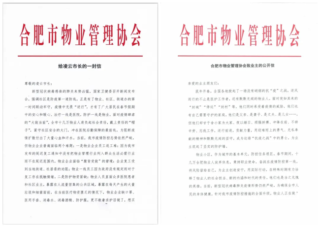 疫情期间,物业服务企业全力投入防疫战,在疫情防控中发挥的作用至关重要,同时也面临着巨大的成本压力和防疫物资缺乏的困境。合肥市物业管理协会积极为物业管理行业发声,2月3日和4日,分别向市主管部门和市政府上报《关于请求物业服务企业防疫相关问题的报告》和《给凌云市长的一封信》,积极反映我市物业行业在此次防疫战中的突出表现,呼吁政府为物业管理行业逆行者站位,让更多人员义无反顾的投入到疫情防护第一线,全力捍卫人民健康,保障公共卫生安全。2月7日,在《合肥市物业管理协会致业主的公开信》中,呼吁社会理解物业行业、支持物业工作,发动业主联防联控,切实做好物业管理区域疫情防控工作,2月18日,再次上报《关于请求新型冠状病毒疫情防控期间向物业服务企业提供支持的报告》,代表合肥市11万物业人建议将物业服务企业纳入社区疫情防控体系;给予物业服务企业财政补贴;免征物业服务企业增值税;对物业服务企业疫情防控工作进行考核奖励;将物业服务行业从业人员因疫情防控工作及其风险需要纳入相关劳动保障及保险救济支持范围。同时拟定《关于新型冠状病毒疫情防控期间向物业服务企业提供支持的建议》模板并号召合肥物协会员单位的区人大(政协)代表积极呼吁,以期引发社会各界和政府有关部门能够给予物业管理行业关注和支持。