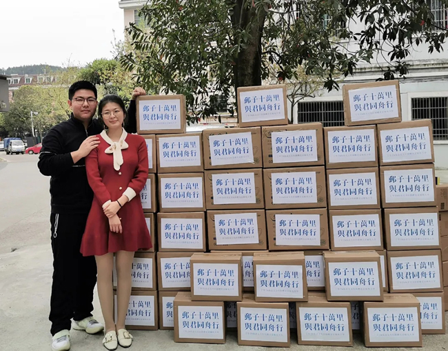 3月17日,和挚爱亲朋吃完一顿简单的便餐,这对90后准夫妻来不及庆祝,就和家人一起打包装运7200个一次性医用口罩和1000包消毒湿巾,并以“邮子十万里,与君同舟行”寄语母校。丁华宇表示:邮子十万里,与君同舟行这句寄语借鉴了复星给意大利捐赠物资箱上的祝福:西程十万里,与君同舟行,表达了自己既是“游子”,也是“邮子”,虽远距他方,但仍希望能和母校同舟共济,共克时疫。同时,在订婚的日子里捐出这笔物资,也算是一种特别的订婚仪式,值得铭记一辈子。