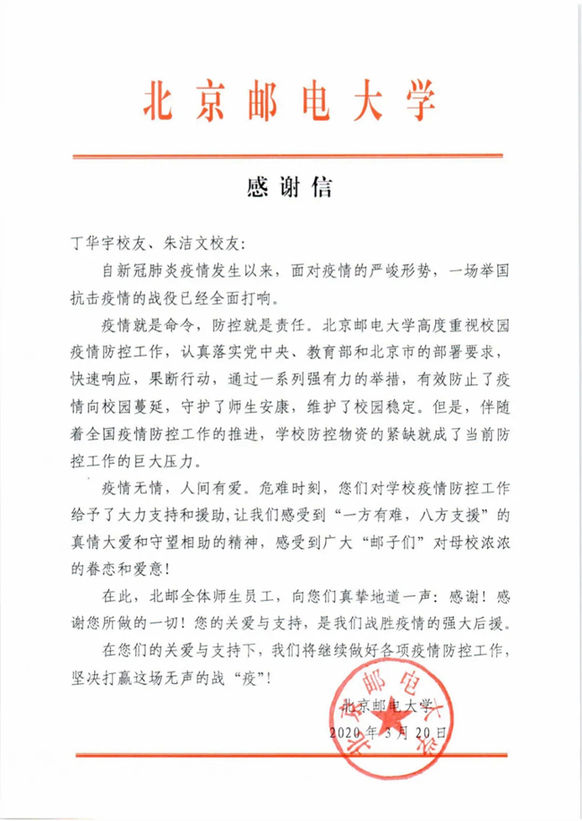 经过多方面考虑,丁华宇和朱洁文决定将防疫物资捐赠给自己的母校——北京邮电大学。